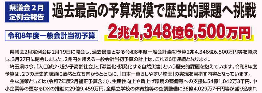 ▶ vol.61-70 vol.62 過去最高の予算規模で歴史的課題へ挑戦 2026.04.01 by 逢澤圭一郎 県議会2月定例会は、過去最高となる一般会計補正予算2兆4,348億6,500万円等を議決し閉会しました。 2兆円を超える一般会計当初予算の計上は、これで6年連続となります。 活動リポート vol.62